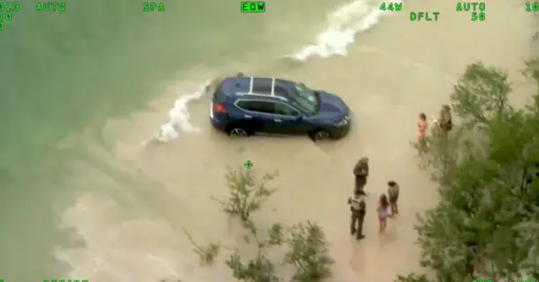 Les imatges de la càmera corporal mostren el SUV blau de Ramsammy submergit al llarg de la costa de la platja: onades estavellant els peus per sobre del maleter.